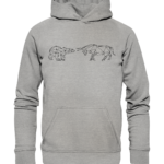 Der Bulle steht für steigende Aktienkurse, der Bär steht für fallende Aktienkurse. Möge der Bär in unserer Ansparphase siegen und der Bulle das Zepter übernehmen, sobald wir uns in der Entnahmephase befinden! Mit einer geometrischen Linienführung überführen wir dieses Prinzip, das so alt ist wie die Börse selbst, in ein modernes und zeitloses Design.