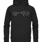 Der Bulle steht für steigende Aktienkurse, der Bär steht für fallende Aktienkurse. Möge der Bär in unserer Ansparphase siegen und der Bulle das Zepter übernehmen, sobald wir uns in der Entnahmephase befinden! Mit einer geometrischen Linienführung überführen wir dieses Prinzip, das so alt ist wie die Börse selbst, in ein modernes und zeitloses Design.